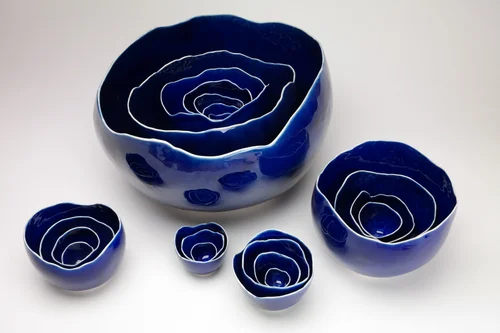 Nesting bowl sets come in a variety of colors numbers and sizes. there are two rim patterns, undulating cut rims and eggshell.