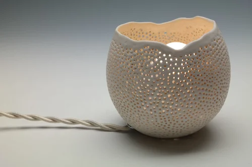 These porcelain vases are shaped and thinned with a wooden paddle and rounded river stone. When the form is nearly bone dry, the thin walls are pierced with a tapered tool and hand cut with an exacto knife. They are designed to be playful as the user interacts with them to create different arrangements from a simple bud vase to a larger center piece.